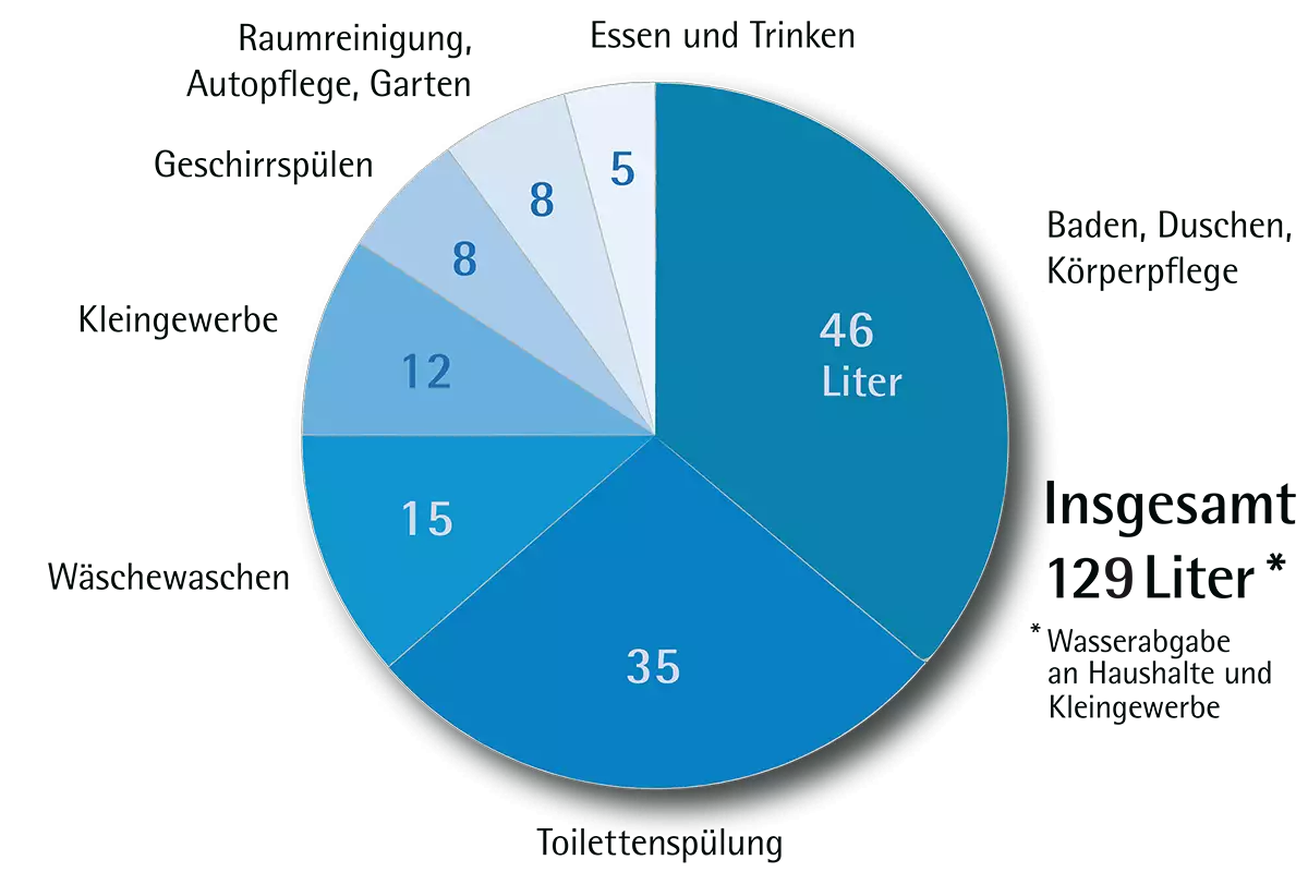 Wasser aus dem Leitungsnetz muss in Deutschland Trinkwasserqualität aufweisen. Egal, ob man es zum Trinken oder zum Kochen, Baden, Wäschewaschen oder für die Toilettenspülung verwendet. Von den ca. 129 Litern Trinkwasser, die jeder Bundesbürger im Durchschnitt pro Tag verbraucht, werden nur ca. 4 Liter für Essen und Trinken verwendet. Direkt getrunken wird sogar nur rund 1 Liter.