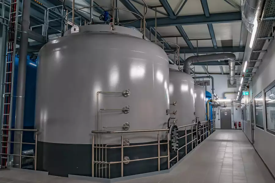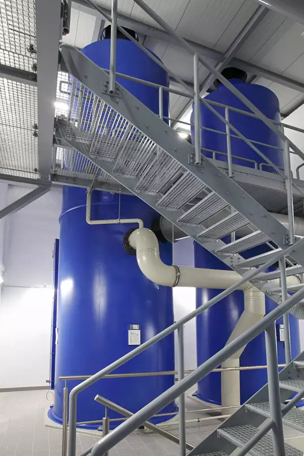 Während des Enthärtungsvorgangs reichert sich das Trinkwasser mit Kohlensäure an. Die beiden nachgeschalteten Riesler entfernen das überschüssige Kohlendioxid durch Belüftung, damit das Wasser später in den Rohrleitungen und Wasserbehältern keine Korrosion verursacht.