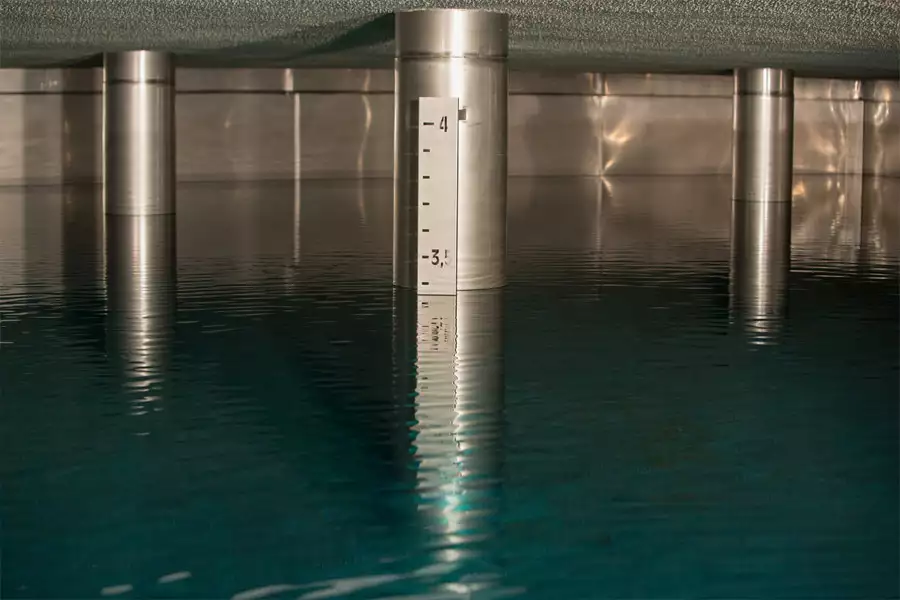 Das unbehandelte Wasser wird aus der Rohwasserkammer in die Ultrafiltrationsanlage geleitet. Bei der Ultrafiltration werden ungelöste Teilchen (Partikel) und Krankheitserreger (Bakterien und Viren) durch eine poröse Membran wie bei einem Sieb zu 100 Prozent herausgefiltert. Die Membran hält alle Stoffe größer als 0,01 µm (=0,00001 mm) zurück.