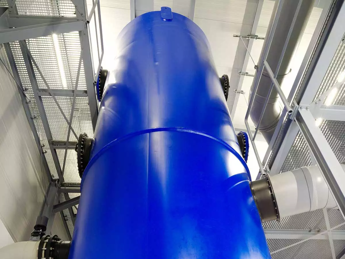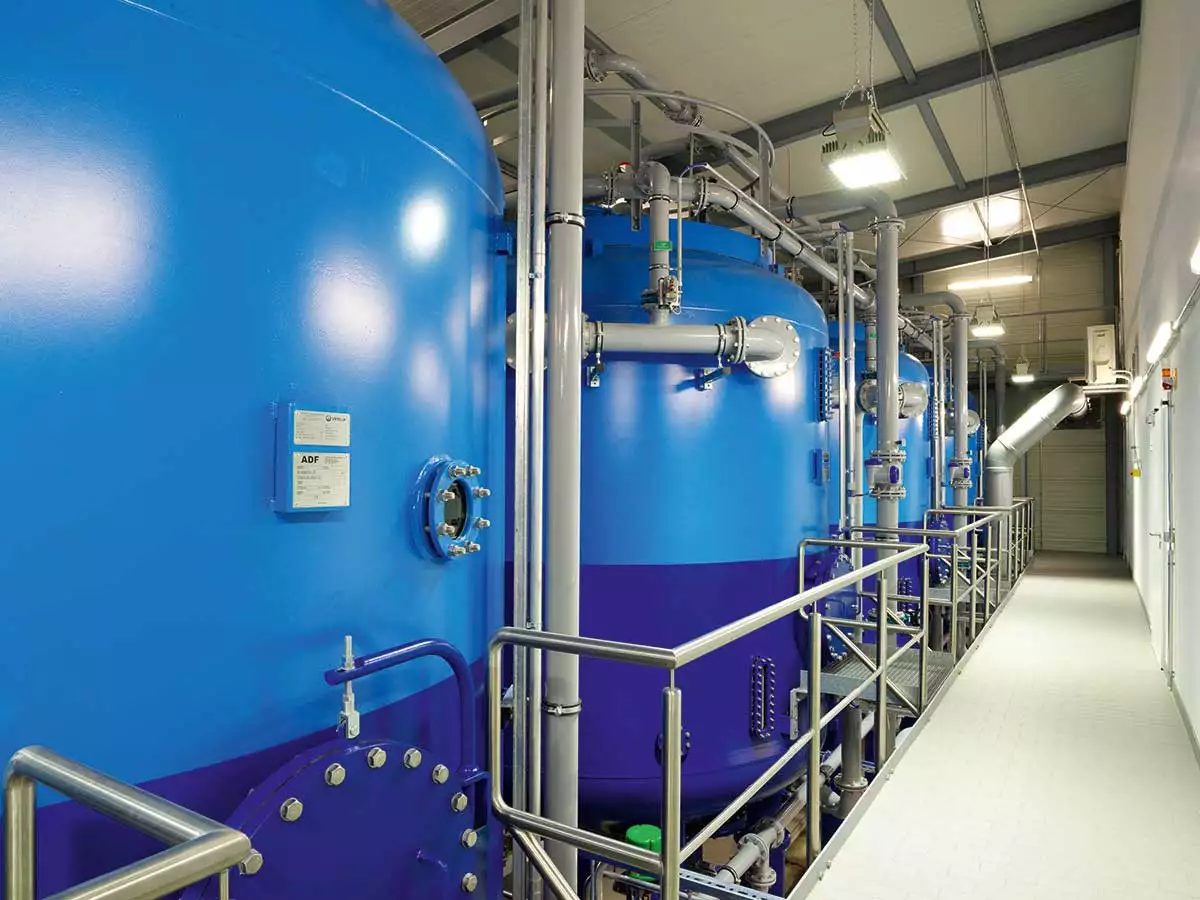 Das unbehandelte Wasser wird aus den Rohwasserkammern zu den beiden Sandfiltern gefördert. An zwei Filterschichten aus Hydro-Anthrazit und Quarzsandschicht bleiben die Trübstoffe hängen. Bei Bedarf, wird ein Flockungsmittel hinzugegeben, wodurch die Trübstoffe leichter herausgefiltert werden können.